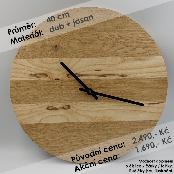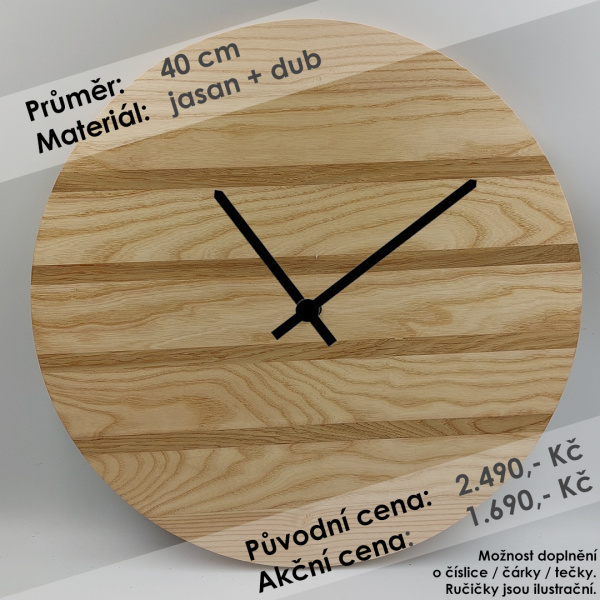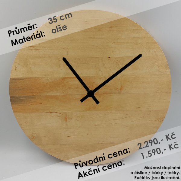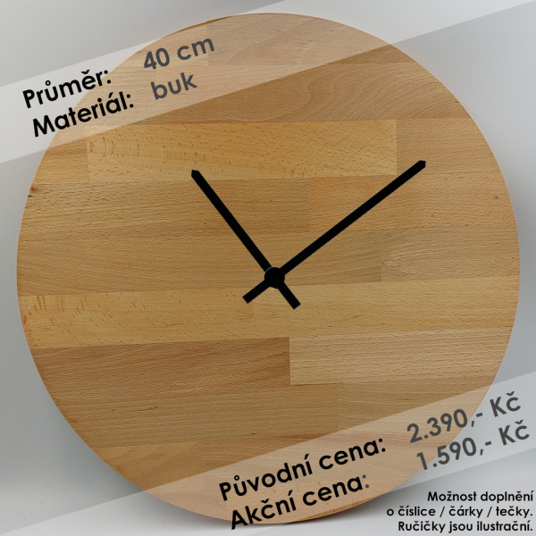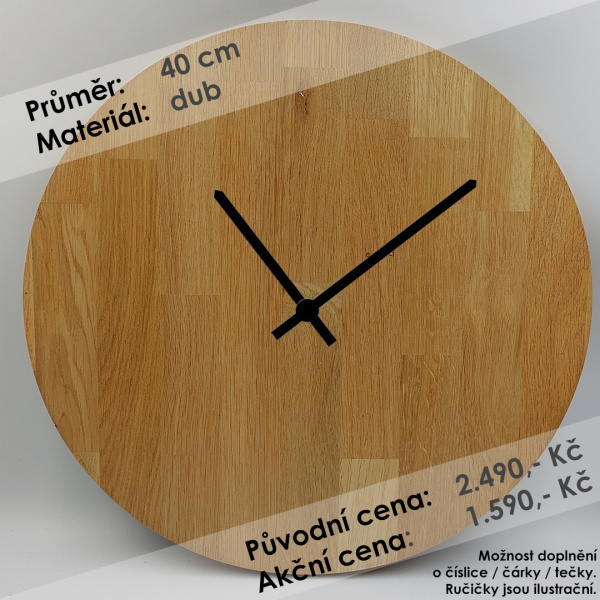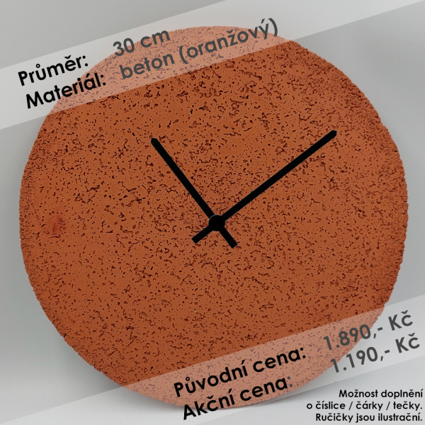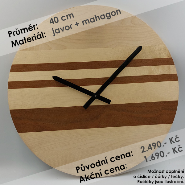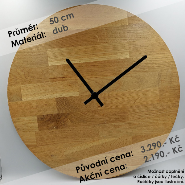 Pozn.: Mohlo se stát, že ceny u níže uvedených nástěnných hodin jsou rozdílné, než v hlavní části eshopu. A je to správně, v eshopu je myšleno na novou zakázkovou výrobu. Níže jsou ciferníky již hotové, připravené k odeslaní tak jak jsou (eventuálně na přání lze vyměnit ručičky nebo dolepit číslice, čárky nebo jiné zobrazení času.